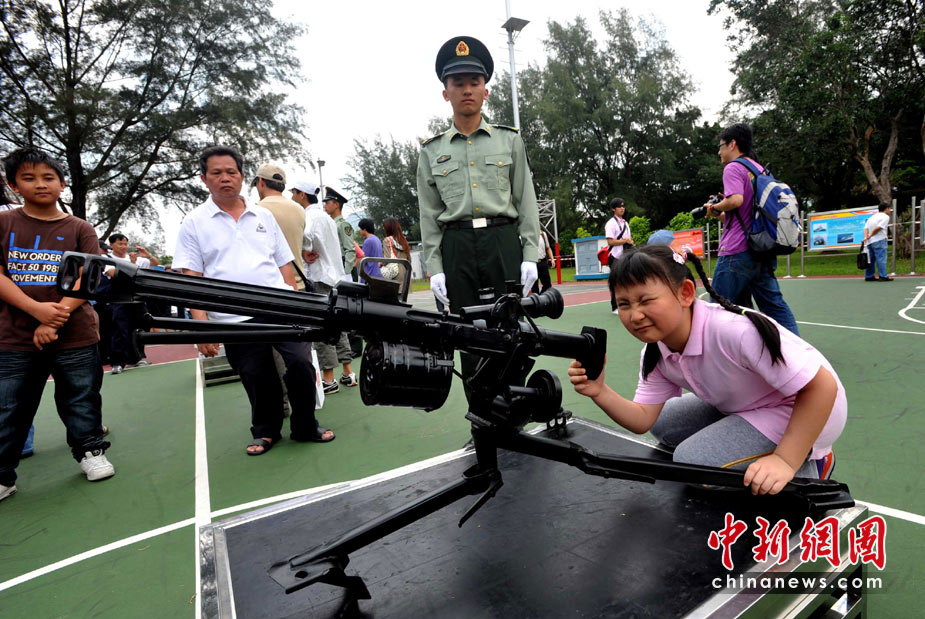 為慶祝“五一”國際勞動節(jié),進(jìn)一步增進(jìn)與香港社會各界相互溝通與交流,中國人民解放軍駐香港部隊(duì)5月2日開放了石崗軍營。圖為香港市民近距離參觀武器展示。 中新社發(fā) 鄧慶樂 攝