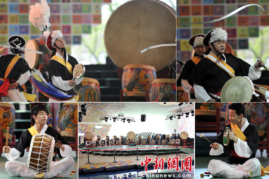 在場館一層還有一個(gè)演藝平臺(tái),有韓國特色的打擊樂演出。中新網(wǎng)記者 王紅綱 攝