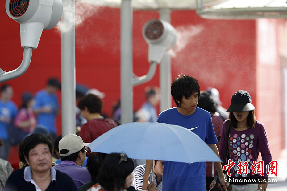 2010年5月2日,上海世博園區(qū)啟動各項控溫降溫設(shè)施應(yīng)對高溫。圖為游客休息區(qū)內(nèi)啟動噴霧降溫系統(tǒng)。中新社記者 盛佳鵬 攝