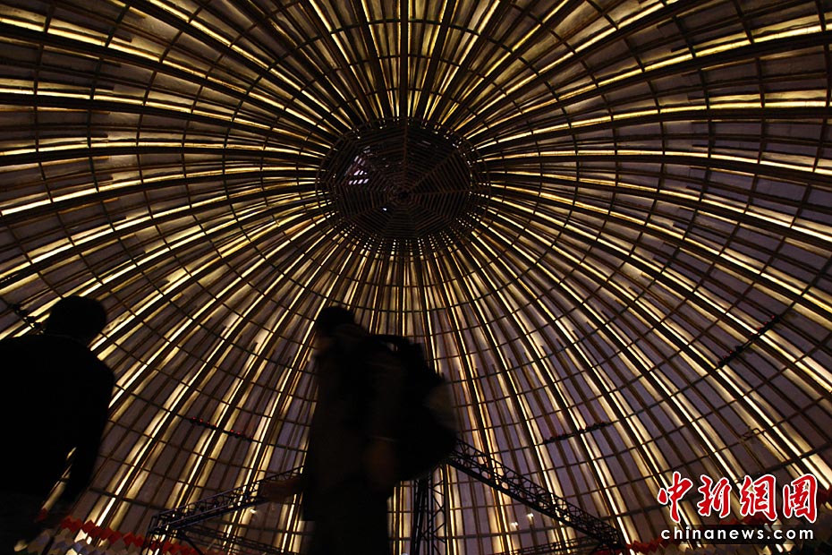 5月2日,上海世博會是第一個正式提出“低碳世博”理念的世博會,圍繞著這樣的理念,上海世博園區(qū)內(nèi)的低碳元素比比皆是。圖為印度館內(nèi)竹制的世界最大穹頂,這個竹制穹頂上方是小型風(fēng)力發(fā)電裝置和太陽能電池板,為整個場館提供綠色清潔能源。中新社發(fā) 湯彥俊 攝