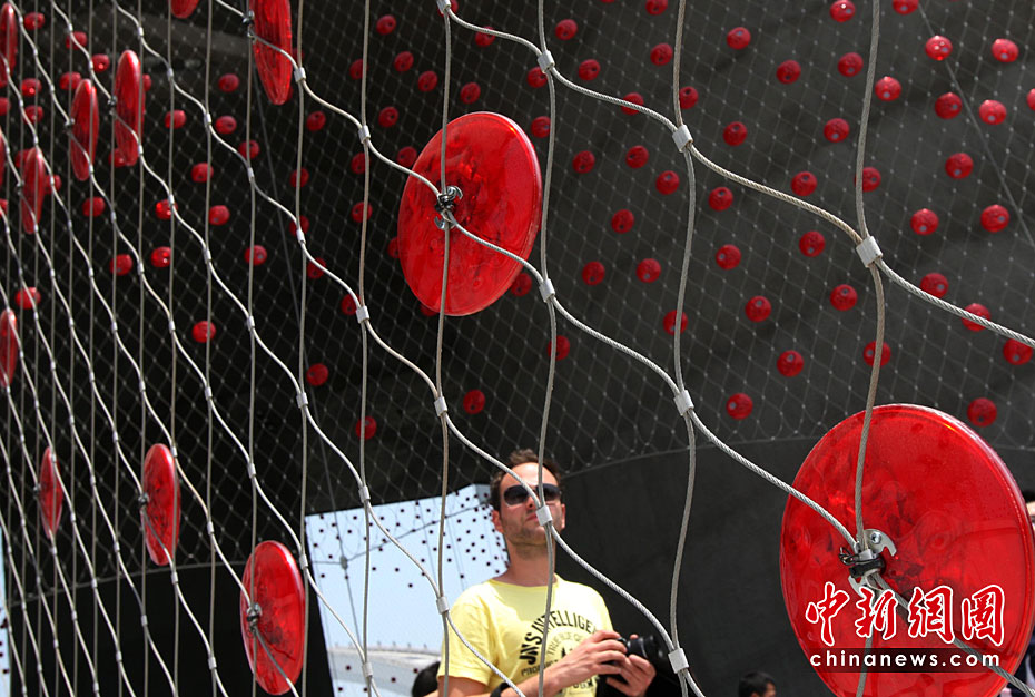 5月2日,上海世博會(huì)是第一個(gè)正式提出“低碳世博”理念的世博會(huì),圍繞著這樣的理念,上海世博園區(qū)內(nèi)的低碳元素比比皆是。圖為瑞士館用大豆纖維制成的紅色幕帷,能發(fā)電,可天然降解。中新社發(fā) 湯彥俊 攝