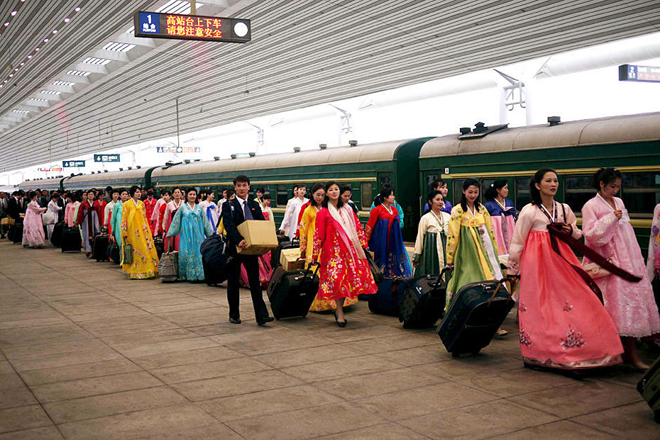5月2日,載著198名朝鮮紅樓夢劇組演員的專列駛入丹東口岸。由朝鮮國家級藝術團-血海歌劇團創(chuàng)作的歌舞劇《紅樓夢》將于5月6日至9日登陸北京電視臺大劇院,這個超大演員陣容亦創(chuàng)下近年來華國外演出人數(shù)之最。圖片來源:新華網(wǎng)