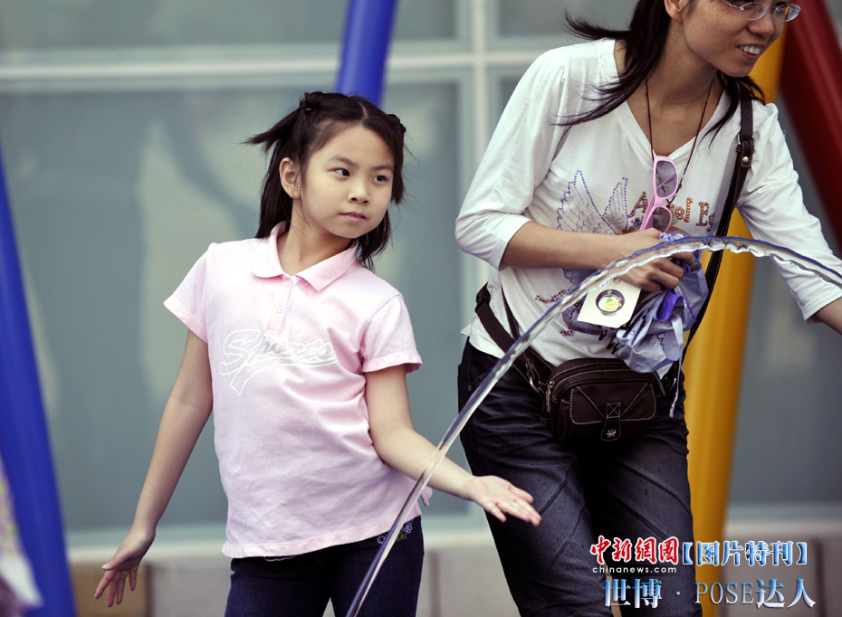 逛世博一定會(huì)拍照留念,擺一個(gè)漂亮有創(chuàng)意的pose尤為重要。面對著鏡頭,挺胸收腹翹臀,一個(gè)微笑,一個(gè)手勢,秀出自己的活力。心中一定要默念:“我留下的不是照片,是心情!”S型的pose不僅是芙蓉姐姐的專用。中新網(wǎng)記者 王紅綱 攝