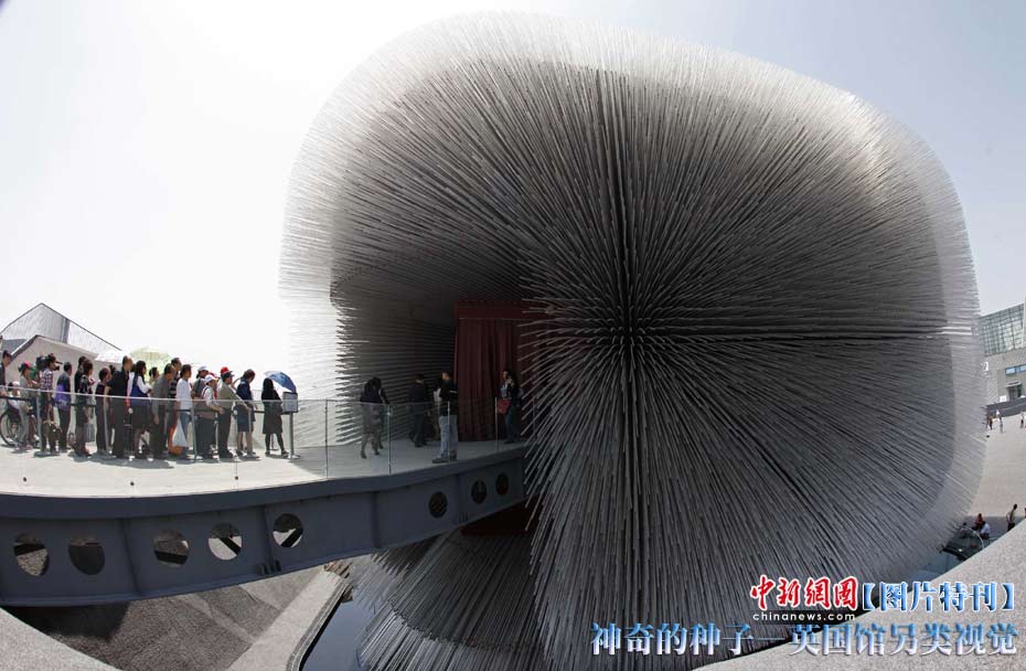 上海世博園開(kāi)園才數(shù)日,自號(hào)“種子圣殿”的英國(guó)館已成人氣最旺場(chǎng)館之一。該館由6萬(wàn)根亞克力桿巧妙構(gòu)成,隨風(fēng)搖動(dòng),頗為新奇。其每根桿子里都含有植物種子。中新社記者 盛佳鵬 攝
