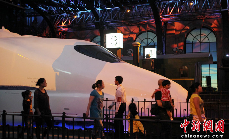 觀眾在上海世博會(huì)“城市生命館”參觀動(dòng)車(chē)組模型。中國(guó)近年在動(dòng)車(chē)交通方面發(fā)展迅速。設(shè)計(jì)師到世界各地考察后認(rèn)為,一個(gè)城市只要通了火車(chē),就開(kāi)始有活力,成為城市發(fā)展的命脈。中新社發(fā) 蘇丹 攝