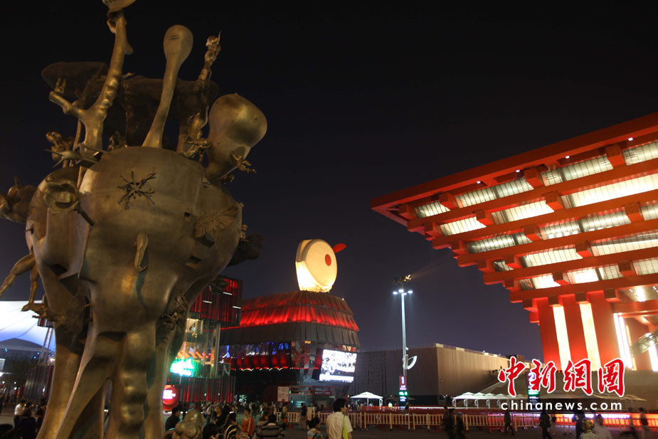 夜幕下的上海世博園區(qū)處處流露光華與璀璨,圖為中國(guó)館與一尊雕塑之間的澳門館。中新社發(fā) 宗金柱 攝
