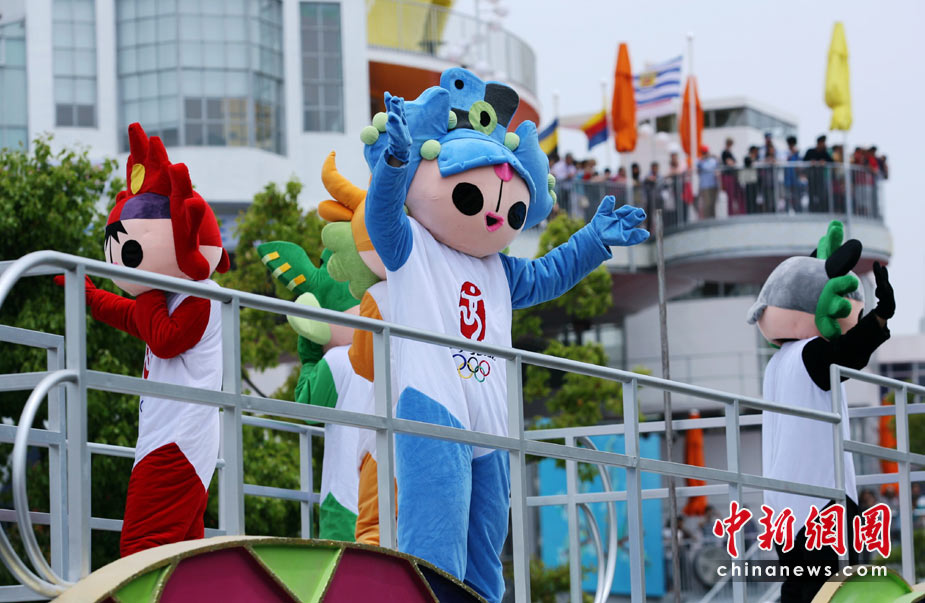 5月4日,世博會北京周花車巡游中的福娃向觀眾揮手致意。當日,世博會北京周開幕。