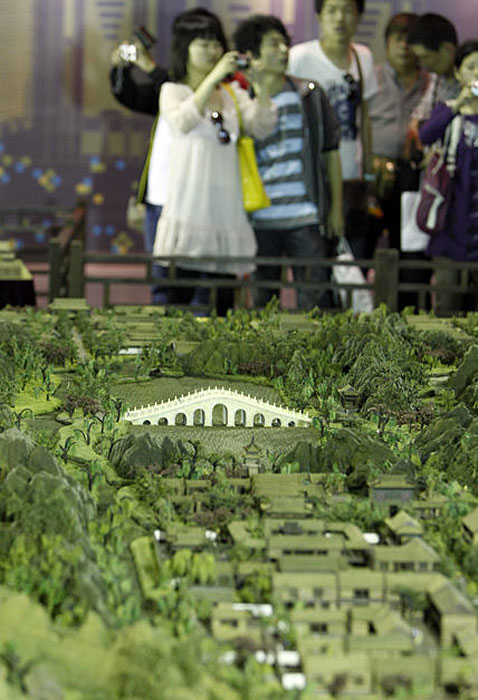 5月4日,游客在參觀縮微版“圓明園”。近日,一座“全景式巨型立雕圓明園”在上海世博會(huì)世界貿(mào)易中心協(xié)會(huì)館亮相。這座縮微版的“圓明園”以1比150的比例制作而成,再現(xiàn)了全盛時(shí)期的圓明園雄偉壯觀的全景。圖片來(lái)源:新華網(wǎng) 裴鑫 攝