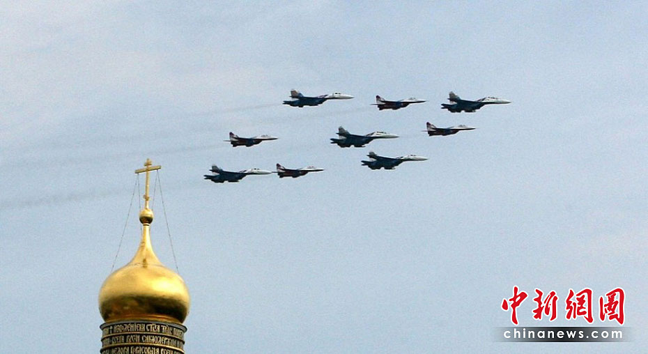當(dāng)?shù)貢r間5月4日,在俄羅斯首都莫斯科,參加彩排的戰(zhàn)機編隊飛過紅場上空。俄羅斯將于5月9日隆重紀(jì)念衛(wèi)國戰(zhàn)爭勝利65周年。圖片來源:中國新聞網(wǎng)