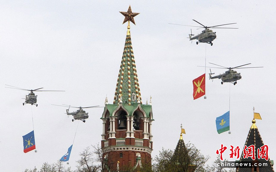 當(dāng)?shù)貢r(shí)間5月4日,在俄羅斯首都莫斯科,參加彩排的戰(zhàn)機(jī)編隊(duì)飛過紅場上空。俄羅斯將于5月9日隆重紀(jì)念衛(wèi)國戰(zhàn)爭勝利65周年。圖片來源:中國新聞網(wǎng)