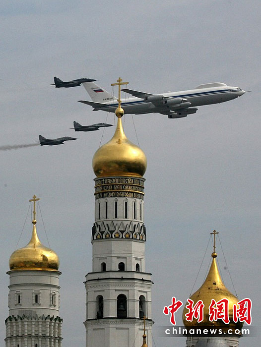 當?shù)貢r間5月4日,在俄羅斯首都莫斯科,參加彩排的戰(zhàn)機編隊飛過紅場上空。俄羅斯將于5月9日隆重紀念衛(wèi)國戰(zhàn)爭勝利65周年。圖片來源:中國新聞網(wǎng)
