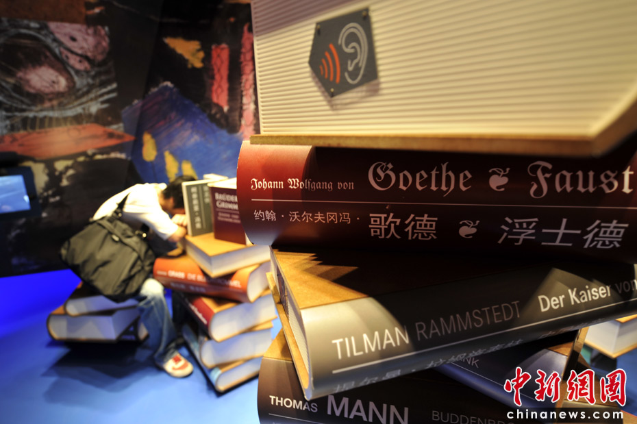 德國(guó)文化的展示區(qū),桌面的讀者可不是睡著了,那本書(shū)是可以發(fā)聲的,他也許是“沉浸”在故事中了。中新網(wǎng)記者 王紅綱 攝