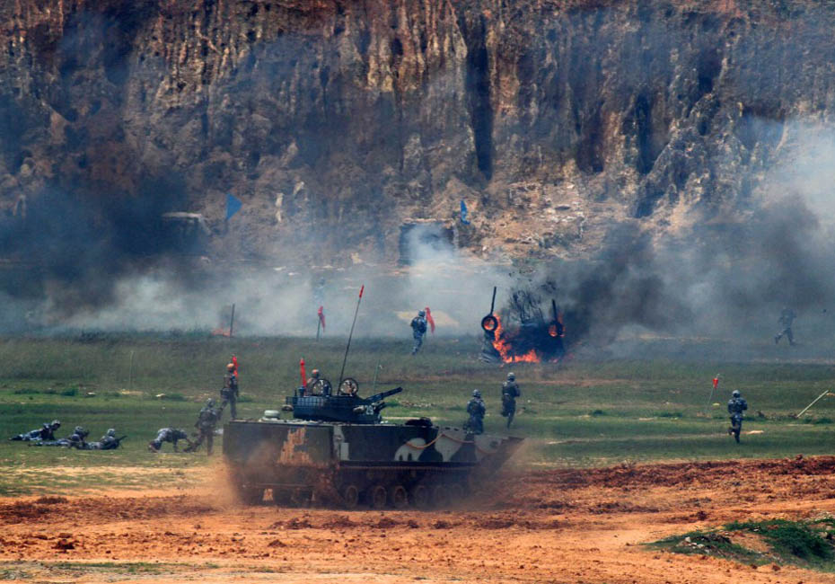 陸戰(zhàn)隊在訓(xùn)練場進(jìn)行登陸作戰(zhàn)實兵實彈演練。圖片來源:新華網(wǎng) 查春明攝