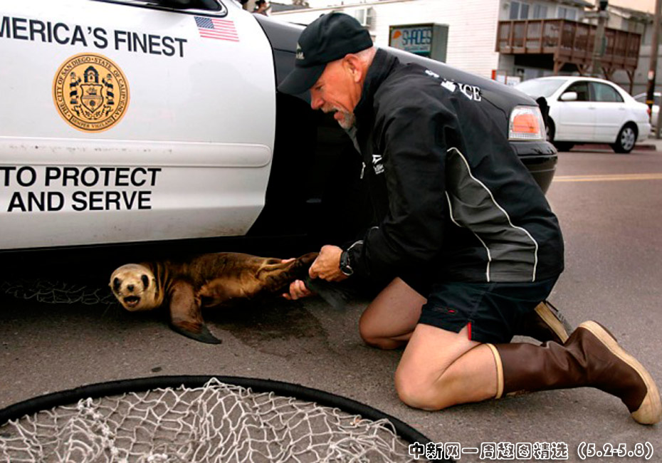5月5日,在加利福尼亞州,動(dòng)物護(hù)理專家羅賓森把一頭小海豹從圣地亞哥警車下拖出。小海豹之前在另一輛車下被發(fā)現(xiàn),看到警察要捉它就躲到了這輛警車下。圖片來源:中國(guó)新聞網(wǎng)>>點(diǎn)擊觀看詳細(xì)內(nèi)容
