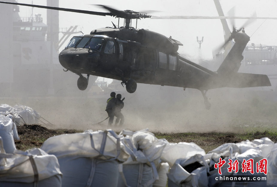 5月11日,美國路易斯安那州,國民警衛(wèi)隊用直升機向河口運載沙袋,試圖阻止海上的油污進入內(nèi)河。