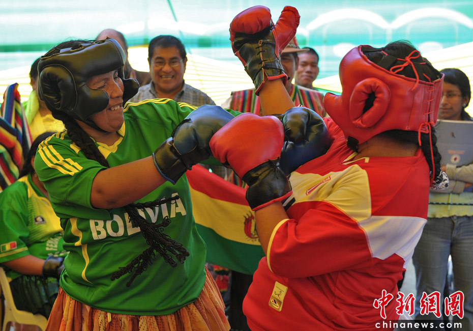 5月13日,秘魯利馬高地舉辦的傳統(tǒng)食品博覽會(huì)上,兩名安第斯農(nóng)民婦女穿著象征秘魯和玻利維亞的裙子同臺(tái)搏擊妙趣橫生。圖片來源:中國新聞網(wǎng)