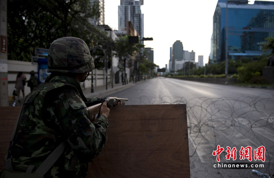 泰國軍隊和反政府的“紅衫軍”16日繼續(xù)在曼谷的多處地點對峙,槍聲和爆炸聲不時響起,曼谷的部分街道已成為“戰(zhàn)區(qū)”。泰國急救醫(yī)療部門17日表示,泰國軍警與反政府“紅衫軍”示威民眾3天來在曼谷街頭爆發(fā)的沖突,死亡人數已經上升到35人。圖片來源:中國新聞網