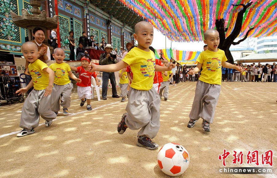 2010年5月15日,韓國首爾曹溪寺院舉行了兒童足球賽,一群四五歲的孩子和小和尚參加了這場足球友誼賽。這場比賽是佛誕節(jié)活動(dòng)的一部分,也是為了迎接2010世界杯足球賽的到來。Chung Sung-Jun