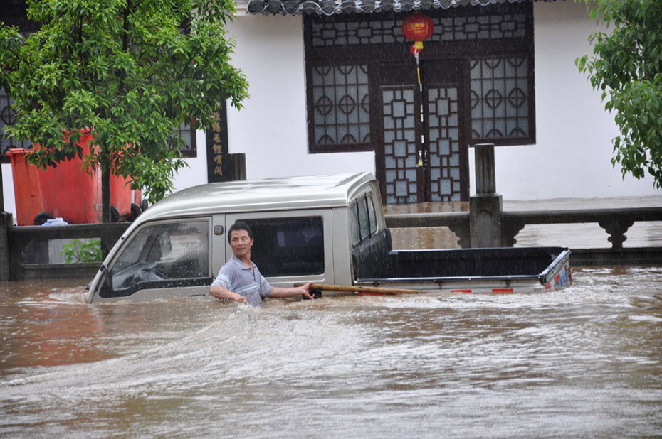 2010年5月18日,江西婺源遭受暴雨洪澇災(zāi)害,在婺源縣城,一輛汽車和車主被洪水圍困。單長華 攝 (圖片來源:新華網(wǎng))