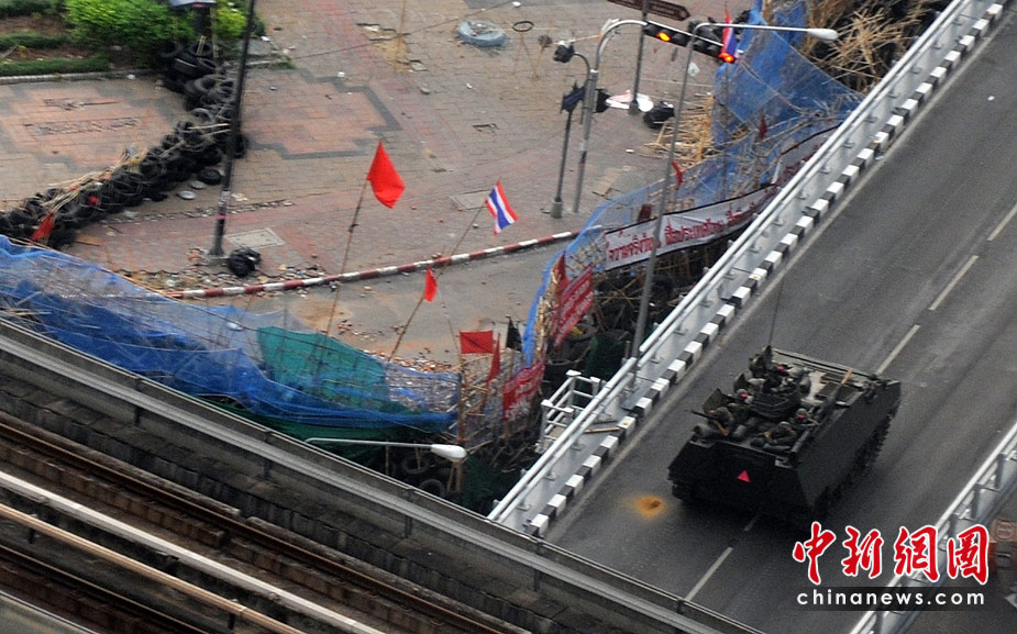 19日清晨,數(shù)百名軍警在武裝車輛的掩護下向反政府示威者在曼谷的大本營聚集。自上周四紅衫軍與政府在曼谷爆發(fā)沖突以來,已經(jīng)導致39人死亡,數(shù)百人受傷。