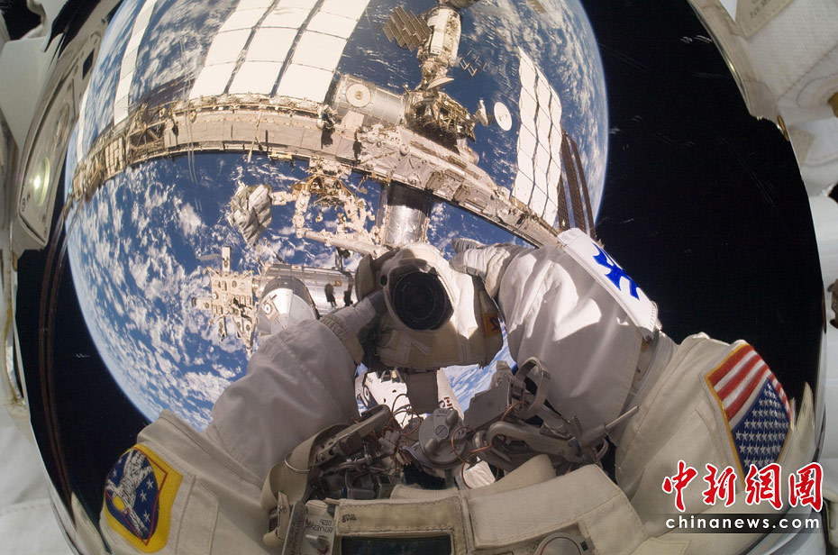 美國(guó)當(dāng)?shù)貢r(shí)間5月17日,“亞特蘭蒂斯”號(hào)航天飛機(jī)宇航員加雷特·賴斯曼和史蒂夫·鮑恩進(jìn)行了與國(guó)際空間站對(duì)接后的首次太空行走。圖片來源:中國(guó)新聞網(wǎng)