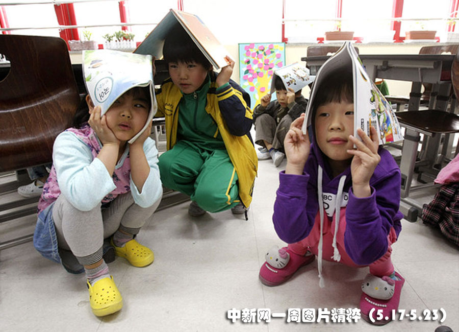 近日,首爾的一次地震演習(xí)中,韓國(guó)小學(xué)生將筆記本蓋在頭上蹲在課桌旁。各地方政府當(dāng)天也參與了這次全國(guó)性的地震演習(xí)。