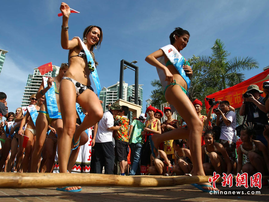 5月23日,全球64位比基尼佳麗們參加了三亞“清涼一夏 文化三亞”夏季旅游促銷活動(dòng)的啟動(dòng)儀式及系列主題活動(dòng),與三亞市民和游客親密接觸,跳起了歡快的竹竿舞,并乘豪華游艇暢游三亞。中新社記者 富田 攝