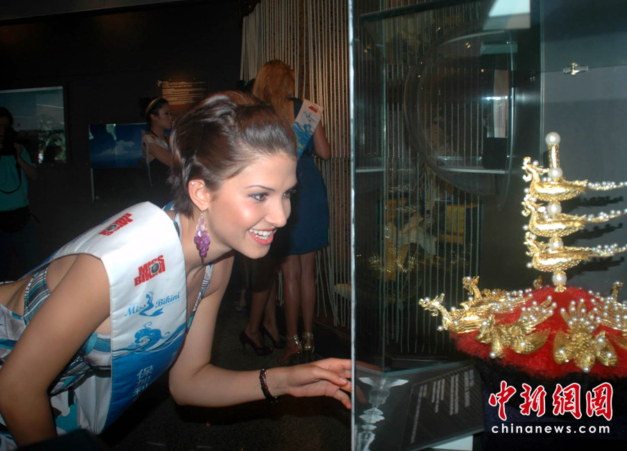 5月24日,海南三亞,正在此間參加第35屆國際比基尼小姐全球總決賽的64位佳麗,參觀了三亞一家珍珠博物館。佳麗們對漂亮的珍珠十分鐘愛,在攝影師前擺出各種“POSE”,留下美麗身影。圖為佳麗對漂亮的中國清朝時期皇后的皇冠(仿制品)興趣濃厚。 中新社記者 尹海明攝