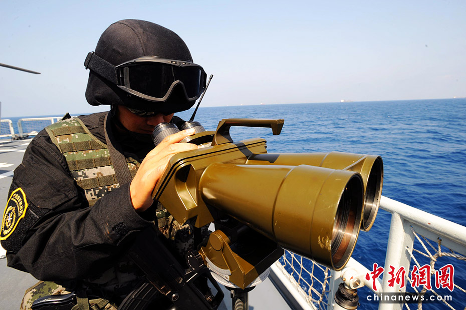 特戰(zhàn)隊員使用高倍望遠(yuǎn)鏡觀察瞭望。江山 攝