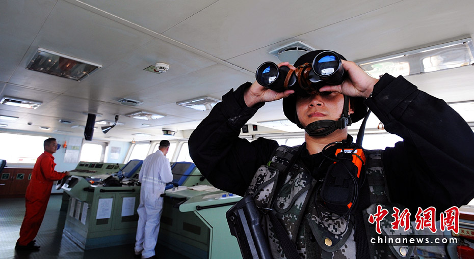 4月13日上午9時,特戰(zhàn)隊員在駕駛室瞭望警戒。船長戴濤說,有特戰(zhàn)隊員在身邊,即使航行在海盜猖獗的亞丁灣海域,心里也特別踏實。江山 攝