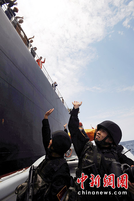 4月16日當(dāng)?shù)貢r間11時,第五批護(hù)航編隊圓滿完成第188批護(hù)航任務(wù),在“嘉永山”輪船實施隨船護(hù)衛(wèi)的4名特戰(zhàn)隊員換乘小艇離開時,船員紛紛來到甲板與他們揮手告別。江山 攝