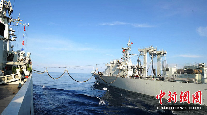 3月9日上午,第五批護(hù)航編隊在印度洋進(jìn)行了首次海上補(bǔ)給!拔⑸胶本C合補(bǔ)給艦對“廣州”號導(dǎo)彈驅(qū)逐艦進(jìn)行了橫向的液貨補(bǔ)給。江山 攝