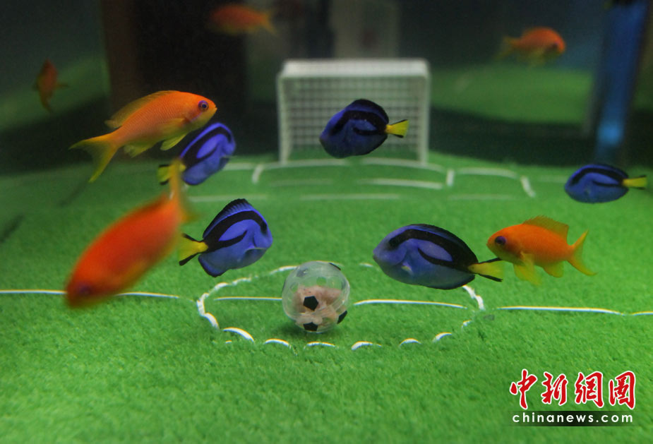 5月23日,日本橫濱八景島海洋世界水族館中,一群魚(yú)兒在“踢足球”,藍(lán)色魚(yú)代表日本隊(duì),橘色魚(yú)代表荷蘭隊(duì)。在2010年南非“世界杯”上,日本將迎戰(zhàn)荷蘭隊(duì)。