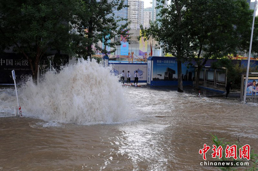 2010年5月25日下午4點半左右,北京京廣橋附近發(fā)生水管爆裂,水柱噴射到兩層樓高,流出的水已成河,造成東三環(huán)嚴重擁堵。牛宏超 攝(圖片來源:CFP)