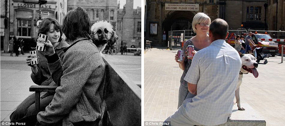 朱迪和戴夫在廣場的長椅上邊小憩邊喝冷飲,當時二人正在慶祝朱迪的21歲生日。30年過去了,他們已經(jīng)是3個孩子的父母,身邊的寵物狗換了一條,夫妻倆的感情還是那么深厚。