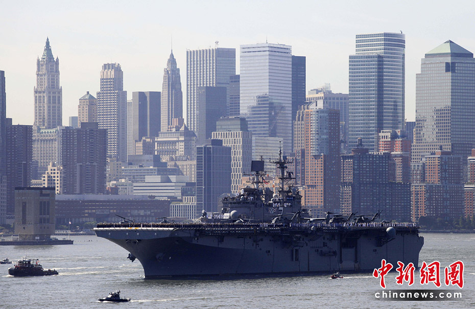 當?shù)貢r間5月26日,美國第23屆紐約艦隊周開幕,包括“硫磺島”號兩棲攻擊艦在內(nèi)的11艘參加艦隊周活動的軍艦由南向北在哈得孫河面上游弋。紐約民眾將以?吭诼D哈得孫河86號碼頭的“無畏號”航母博物館為中心,展開為期一周的慶祝和紀念活動。圖片來源:中國新聞網(wǎng)