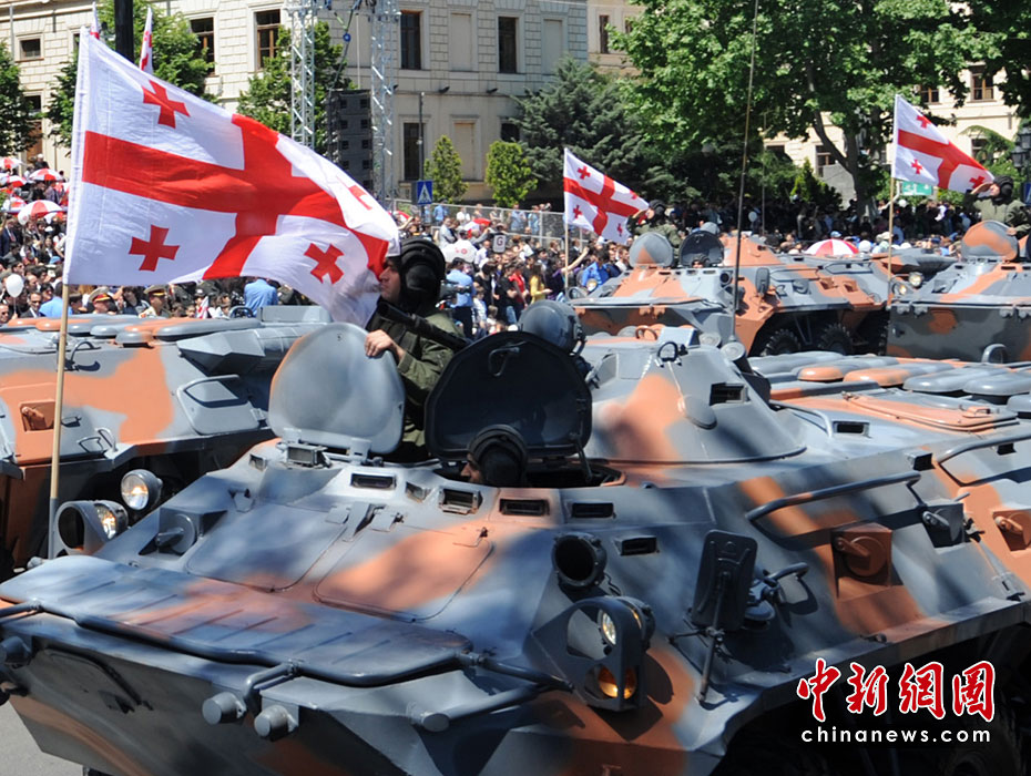 5月26日,在格魯吉亞首都第比利斯,受閱部隊(duì)從議會(huì)大廈前走過。當(dāng)日,格魯吉亞在第比利斯舉行慶祝格獨(dú)立日閱兵典禮,格總統(tǒng)薩卡什維利在議會(huì)大廈前檢閱軍隊(duì)并發(fā)表演講。圖片來源:中國新聞網(wǎng)