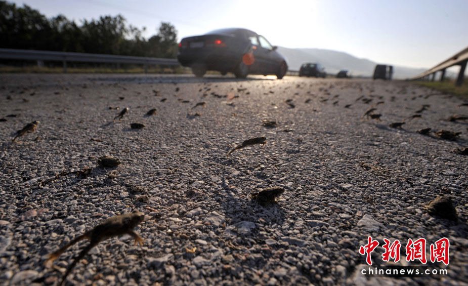 26日,希臘東北部地區(qū)的一條高速公路遭數(shù)百萬只青蛙“占據(jù)”而被迫關閉了兩個小時。圖片來源:中國新聞網(wǎng)>>點擊觀看詳細內(nèi)容