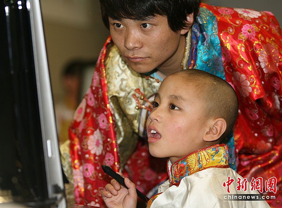 5月31日,玉樹地震孤兒多杰仁青在老師的指導(dǎo)下在北京國家圖書館體驗(yàn)新開通的少兒數(shù)字圖書館,迎接六一兒童節(jié)。這批玉樹孤兒共23名,于5月23日抵京,由“中華少年兒童慈善救助基金會”安置。在北京度過“六一”后,他們還將休整3個月,待災(zāi)區(qū)情況穩(wěn)定后,中華兒慈會將與當(dāng)?shù)氐拿裾块T協(xié)商,在征求孤兒本人意愿的基礎(chǔ)上,或讓他們返回原地上學(xué),或者在內(nèi)地長期居住;饡䦟⒁恢敝С炙麄兊18歲成人。中新社發(fā) 蘇丹 攝