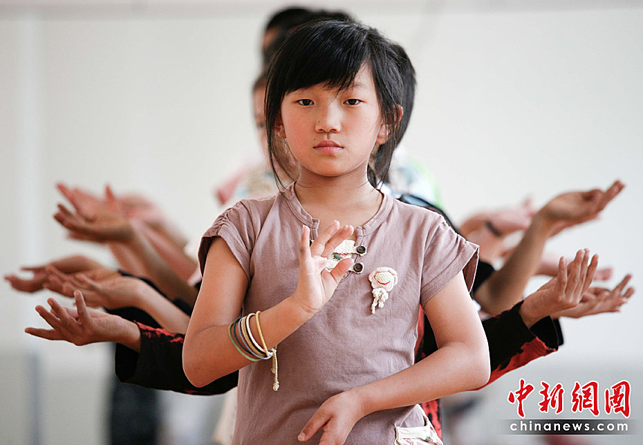昆明市盲啞學(xué)校創(chuàng)建于1922年,是云南省第一所也是規(guī)模最大的一所特殊教育學(xué)校。學(xué)生除文化課程外,還根據(jù)學(xué)生特點,教授學(xué)生工藝美術(shù)、推拿按摩等技能,為他們以后的生活打下了堅實的基礎(chǔ)。圖為5月31日,在學(xué)習(xí)“千手觀音”舞蹈的學(xué)生。中新社記者 劉冉陽 攝
