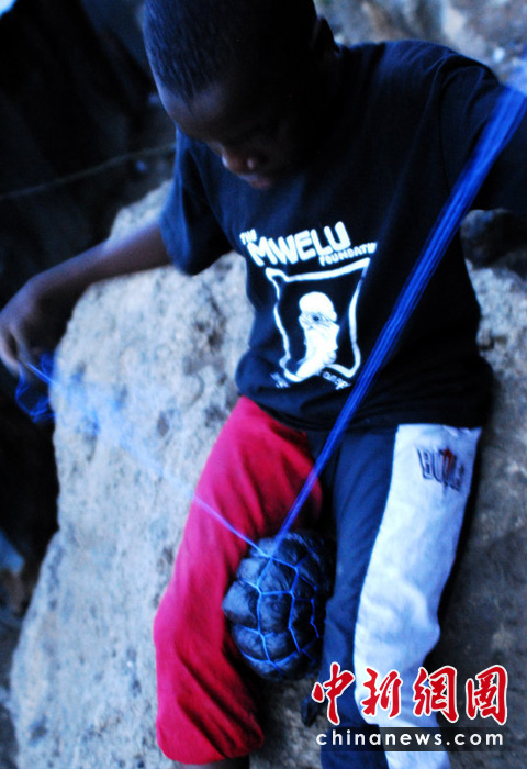 生活在肯尼亞首都內(nèi)羅畢(Nairobi) Muthare難民營的小孩兒沒有能力買足球、足球鞋,更別說專業(yè)足球隊員穿的成套的球衣了。但是這些沒有給他們對足球運動的喜愛產(chǎn)生任何影響。孩子們從當(dāng)?shù)氐睦褤靵硭芰峡诖退芰纤槠约簞邮肿觥白闱颉薄?圖片來源:CFP