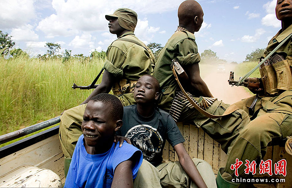 學(xué)校放假了,Ronald(左)和Ongom(右)乘卡車回到烏干達(dá)帕德爾境內(nèi)流民營。Ronald(左)和Ongom(右)以前都是兒童軍。在穿越叛軍活動(dòng)頻繁的地區(qū)時(shí),有士兵保護(hù)他們的安全。圖片來源:CFP