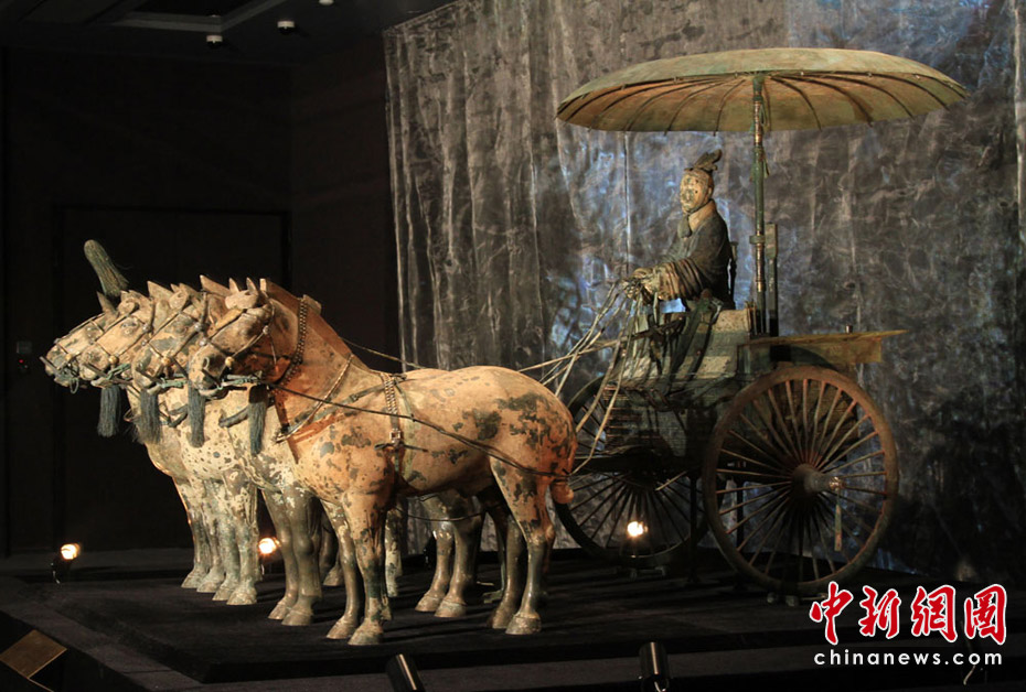 6月1日,秦始皇帝陵出土的“一號(hào)銅車馬”亮相世博會(huì)中國(guó)國(guó)家館,這是它出土30年以來(lái)第一次“駛出”陜西。這件國(guó)寶級(jí)文物在地下歷經(jīng)了2200多個(gè)春秋,于1980年出土,通體彩繪,為雙輪,單轅,駟馬系駕,總重約1061公斤。銅車馬共由3500多個(gè)零件組成,除一些金、銀飾件外,其余全部為青銅鑄件。中新社記者 殷春永 攝