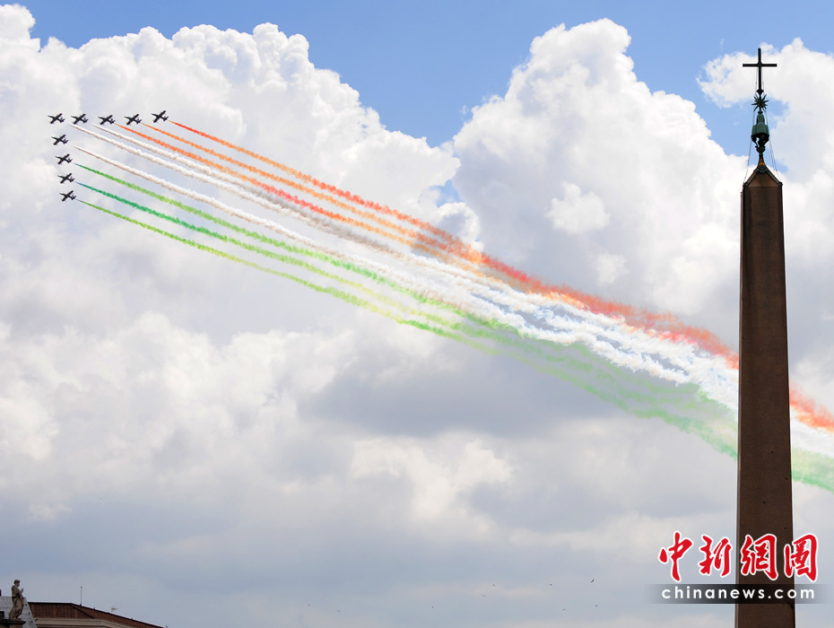 當(dāng)?shù)貢r間6月2日,意大利首都羅馬舉行盛大儀式慶祝國慶日。意大利“三色箭”飛行表演隊在首都上空進行了飛行表演。