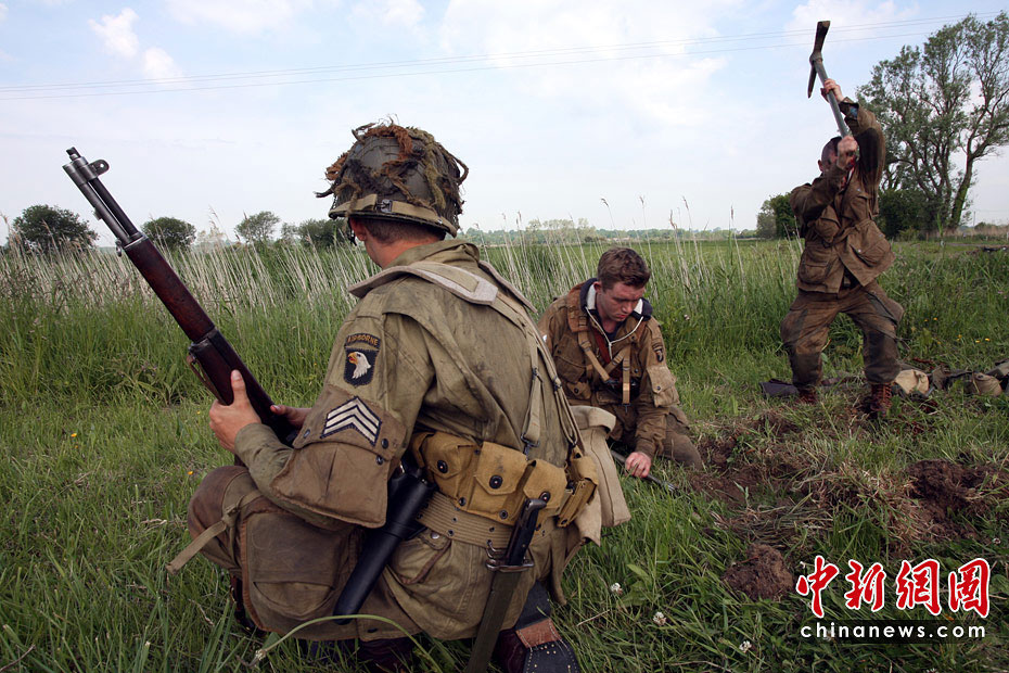 6月5日,諾曼底登陸66周年前夕,一批演員身著二戰(zhàn)時(shí)期美軍軍服,在法國(guó)諾曼底卡倫坦重現(xiàn)了這次著名的戰(zhàn)役。