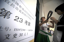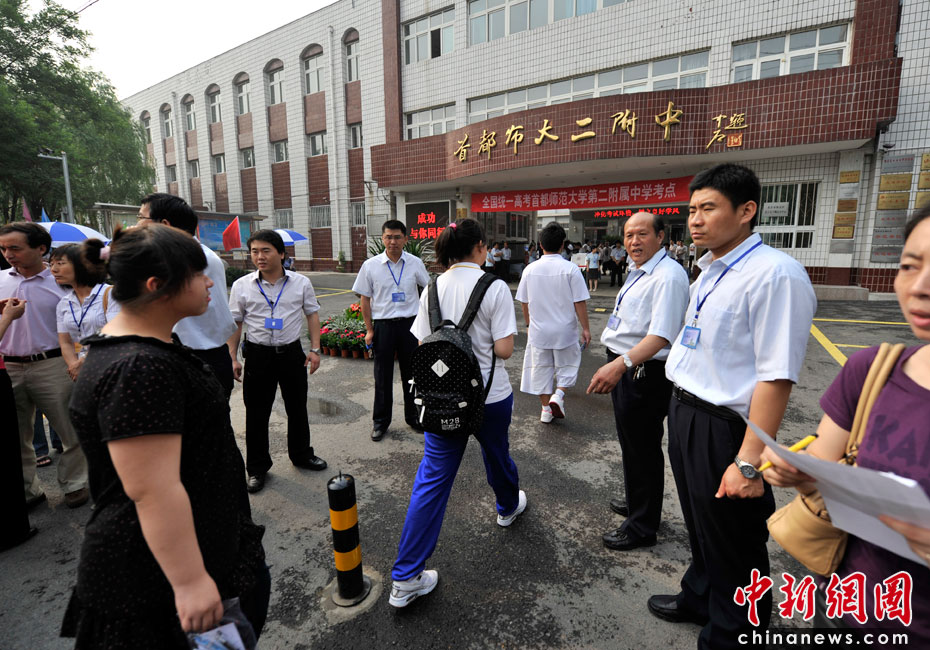 2010年全國高考6月7日日拉開大幕,957萬考生走進(jìn)考場(chǎng)。由于報(bào)名人數(shù)減少,而招生計(jì)劃增加,教育部預(yù)計(jì)今年全國高考平均錄取率將會(huì)增加近7%。圖為首都師范大學(xué)第二附屬中學(xué)考點(diǎn)。中新網(wǎng)記者 金碩 攝
