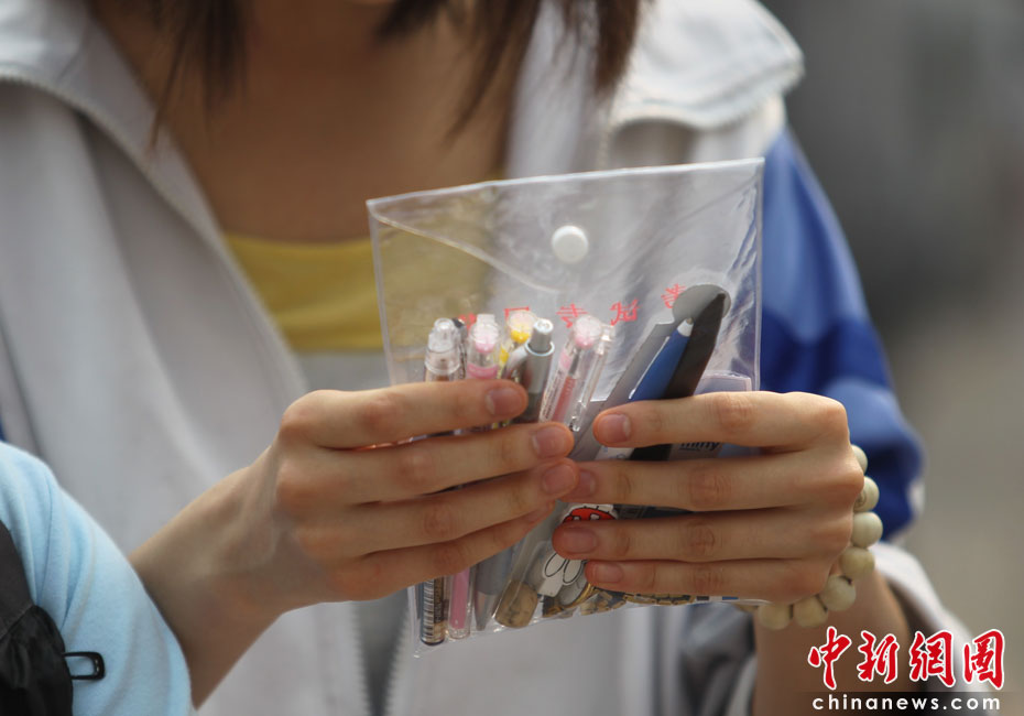 2010年全國(guó)高考6月7日日拉開大幕,957萬(wàn)考生走進(jìn)考場(chǎng)。由于報(bào)名人數(shù)減少,而招生計(jì)劃增加,教育部預(yù)計(jì)今年全國(guó)高考平均錄取率將會(huì)增加近7%。圖為考生“武器”充足。中新社發(fā) 蘇丹 攝