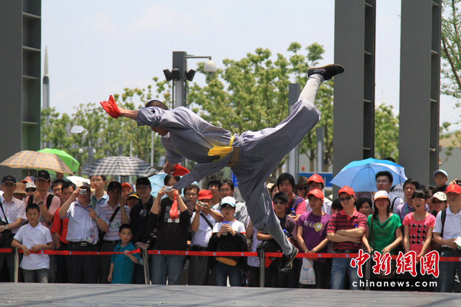 自5月1日開(kāi)始,上海世博園D片區(qū)綜藝廣場(chǎng)每天都有少林寺功夫展演,受到世博參觀者的熱捧。中新社記者 殷春永攝