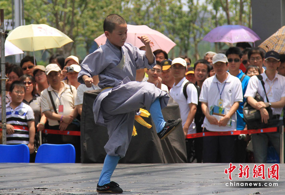 自5月1日開始,上海世博園D片區(qū)綜藝廣場每天都有少林寺功夫展演,受到世博參觀者的熱捧。中新社記者 殷春永攝