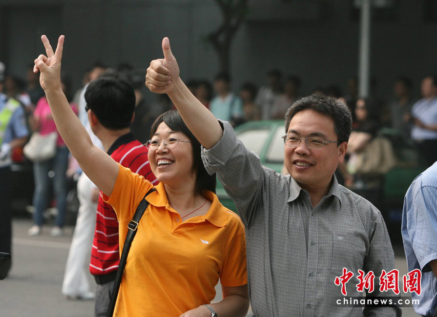 6月7日,為期兩天的2010年普通高等學校招生全國統(tǒng)一考試開考,全國將有957萬考生走進考場。圖為兩位家長在目送孩子進入考場后,不忘做出鼓勵的手勢。楊登峰攝